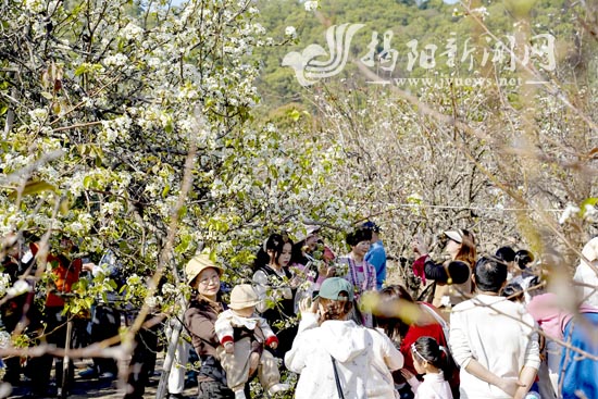 活动现场人流如织,笑语盈盈。千亩梨花迎春绽放,洁白如雪的花瓣缀满枝头,与精心布置的主题打卡点相互映衬,铺展出一幅“人在画中游”的乡村新画卷。来自潮汕三市的游客或随团而至,或自驾而来,扶老携幼穿行花海,在春光中定格浪漫瞬间。