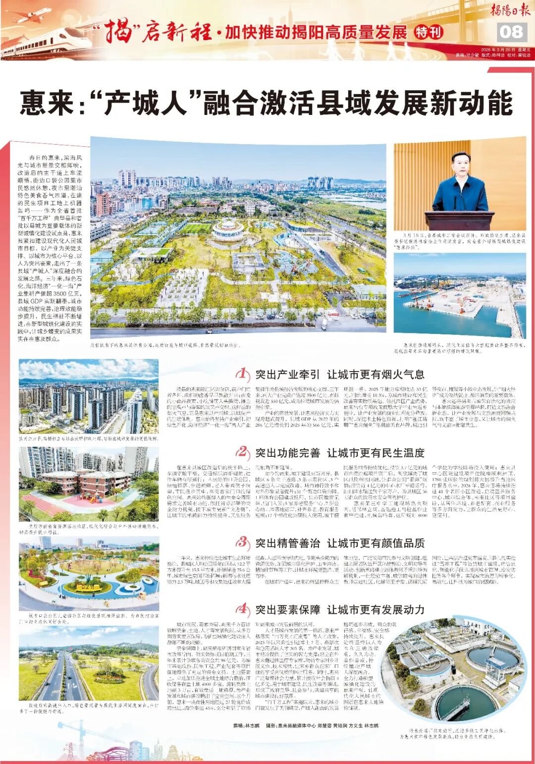 春日的惠来,滨海风光与城市新景交相辉映,改造后的主干道上车流顺畅,街边口袋公园里市民悠然休憩,夜市里潮汕特色美食香气四溢,在建的民生项目工地上机器轰鸣……作为全省首批“百千万工程”典型县和首批以县城为重要载体的新型城镇化建设试点县,惠来县紧扣建设现代化人民城市目标,以产业为关键支撑、以城市为核心平台、以人为突出要素,走出了一条县域“产城人”深度融合的发展之路。三年来,绿色石化、海洋经济“一化一海”产业集群产值超3500亿元,县域GDP实现翻番,城市功能持续完善,治理效能稳步提升,民生福祉不断增进,在新型城镇化建设的实践中,让城乡蝶变的成果实实在在惠及群众。