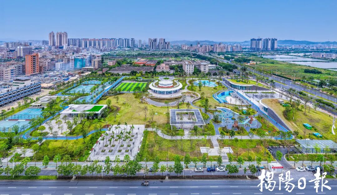 航拍视角下的惠来县体育公园,运动设施与城市道路、自然景观相融共生。